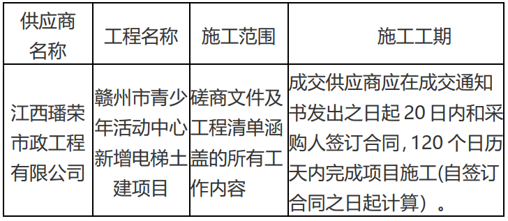 赣州市青少年活动中心新增电梯土建项目公开招标结果的公告